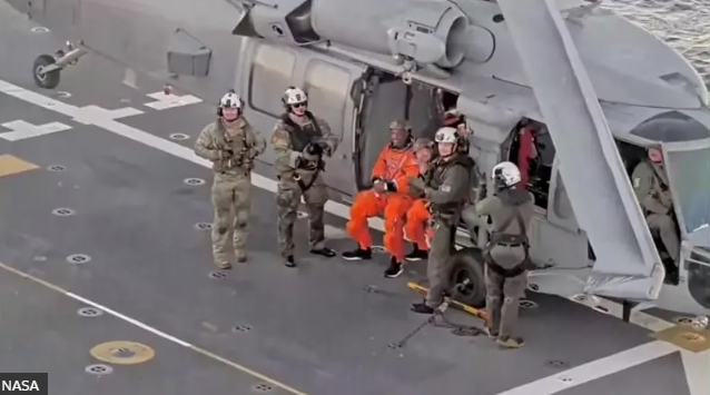 Wiseman, Jeremy Hansen, Victor Glover e Christina Koch foram retirados da cápsula em segurança cerca de 1h30 após o pouso e já estão a bordo de um navio da Marinha dos Estados Unidos, onde passam por avaliações médicas.