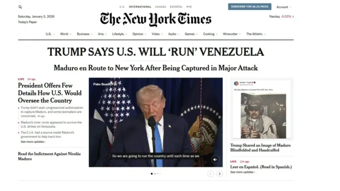 Um dos principais jornais dos Estados Unidos (EUA) – o New York Times (NYT) – publicou neste sábado (3) um editorial criticando as ações do governo de Donald Trump e chamando de ilegal o ataque à Venezuela. Para o jornal, o país sul-americano foi o primeiro alvo da nova doutrina de segurança da Casa Branca para América Latina.