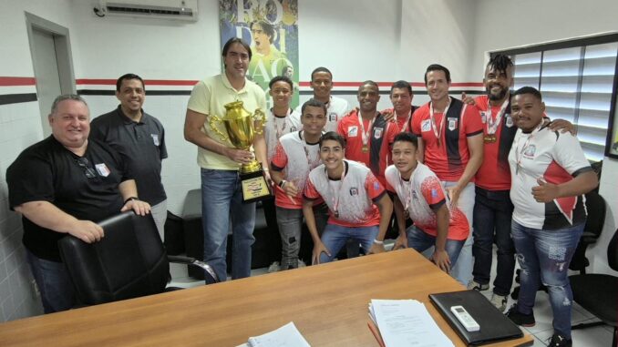 Os bicampeões da Paulistinha Cup de futebol Sub-16 realizaram uma visita ao secretário de Esportes e Lazer, Rodrigo Santana, o Rodrigão, e o subsecretário, Cláudio Luiz Monteiro de Morais, o Camarão, para apresentar o troféu conquistado e as medalhas.