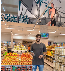 “Para o Dia dos Pais a gente trouxe o conceito do pai santista. As lojas do Nosso Hortifruti estão voltadas para o público de Santos. Pensando em presentear o pai santista a gente pensou em trazer o Afonso que fez o painel na loja 2 para linkar a questão do público santista e que o Nosso Hortifruti abraça esse estilo de vida. Pensamos em fazer a obra de arte ao vivo para dar a essa plateia o gostinho de ter um evento diferente na cidade de Santos e que remetesse ao amor santista que a gente tem”, explica a nutricionista e responsável pelo marketing do Nosso Hortifruti Mariana Imbelloni.