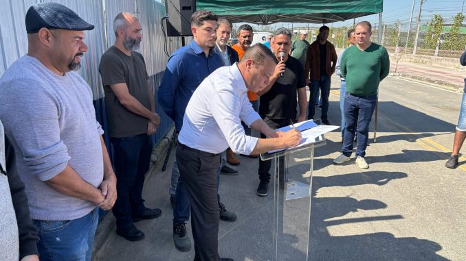 O prefeito de Cubatão César Nascimento assinou nesta quarta-feira (13) a ordem de serviço (OS) que libera o início das obras da Nova Avenida Ferroviária, na Vila dos Pescadores. A intervenção começa na passagem de nível, também conhecida como ‘Frentona’, seguindo até a Rua Coronel Vilar, perto do novo viaduto, e integra o processo de urbanização do bairro, modificando por completo a localidade e a vida da comunidade. O ato de assinatura da OS aconteceu pela manhã, justamente no início da Av. Ferroviária.