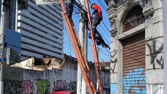 Onze empresas de telecomunicações atuaram na retirada de cabos aéreos ou no reordenamento de sua fiação em 31 postes da Rua João Pessoa, entre a Constituição e a Senador Feijó, no Centro Histórico de Santos.