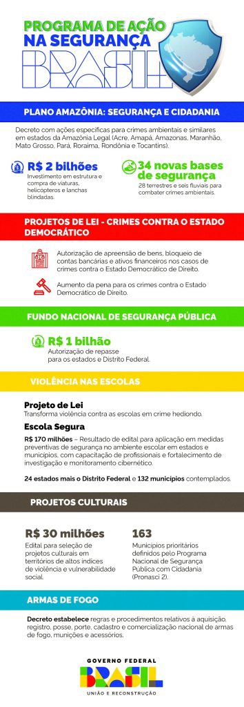 Recursos para prevenir violência nas escolas, repasses para segurança nos estados e municípios, medidas para um controle responsável de armas, edital para projetos culturais em áreas em vulnerabilidade social, um plano de ações para a Amazônia e projetos de lei para ampliar penas para quem pratica crimes em escolas e contra o Estado Democrático de Direito.
